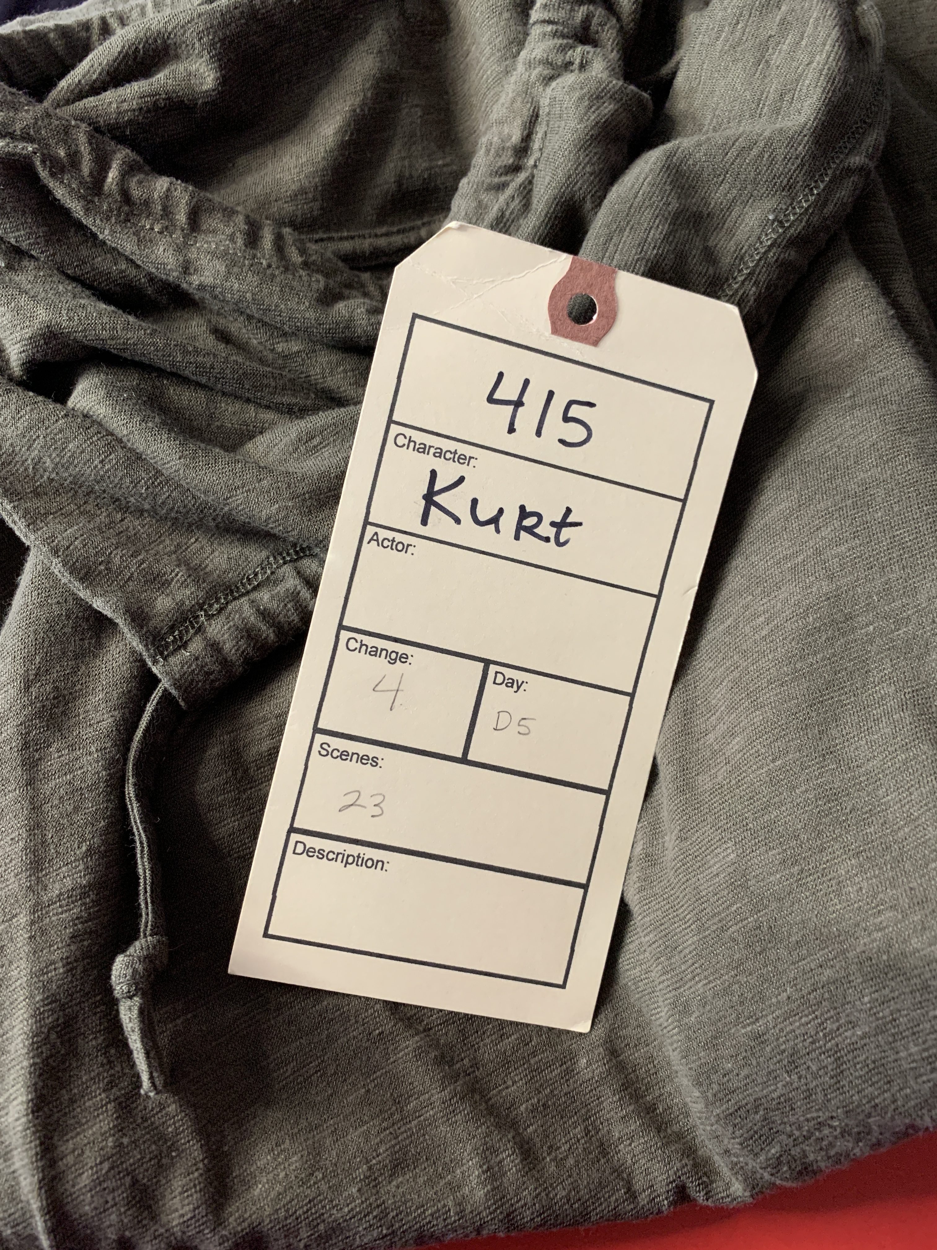There is no tag present that has Chris Colfer or Kurt Hummel written on the tag; as is a custom practice for wardrobe departments. The wardrobe indicates that it was worn with cargo pkt but the cross-out marks mean that these were changed but in the episode you can see that this shirt was worn with black pants (possibly sweat-pant style). It is unclear of the style of pant was possibly changed or if the cross-out reflects something else.